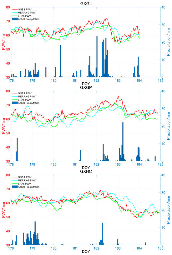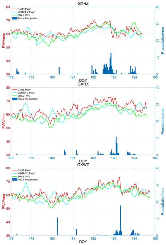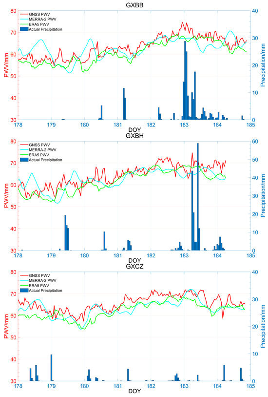 A time series analysis was conducted for GNSS/MERRA-2/ERA5 PWV and the actual precipitation observed at ground meteorological stations on Days 178 to 184 in 2017. The results indicate that MERRA-2/ERA5 PWV exhibits a consistent overall trend with GNSS PWV, and it also closely matches the actual precipitation recorded at the ground meteorological stations. However, the trend of ERA5 PWV agrees more closely with GNSS PWV. These findings demonstrate a direct relationship between PWV variations and rainfall. Prior to the onset of heavy rainfall, PWV increases sharply. When heavy rainfall arrives, PWV reaches its peak. After the rainfall ceases, PWV rapidly decreases to its minimum value and eventually stabilizes. Therefore, ERA5 demonstrates better suitability compared to MERRA-2 during heavy rainfall in the Guangxi region. This assessment effectively demonstrates significant changes in the water vapor and actual precipitation in the Guangxi region, which holds important implications for predicting heavy rainfall events.