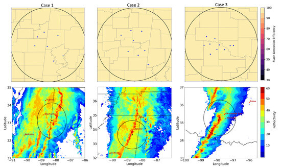 Spatial plot showing LMA sensor locations (blue dots), flash detection efficiency determined using the methods of [5], and radar examples for Case 1 (left), Case 2 (middle), and Case 3 (right). Black circle indicates 100 km range from LMA network center used in matching analysis.