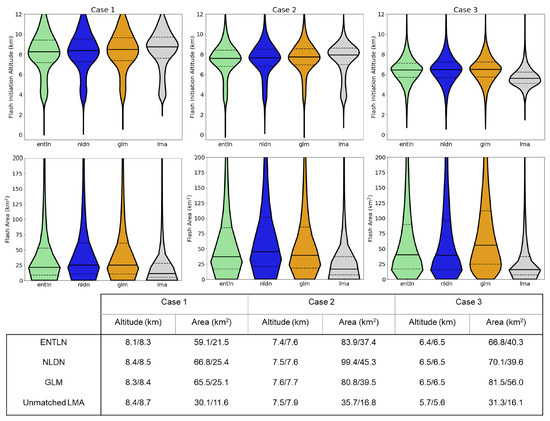 Characteristics of the LMA flashes that were matched to ENTLN (green), GLM (yellow), NLDN (blue), and unmatched LMA flashes (grey) including initiation height (top) and flash area (bottom) for Case 1 (left), Case 2 (middle), and Case 3 (right). Mean/median values for each network and case are also shown below. In violin plot, black solid line is the median, and dotted lines are the 25th and 75th percentiles.