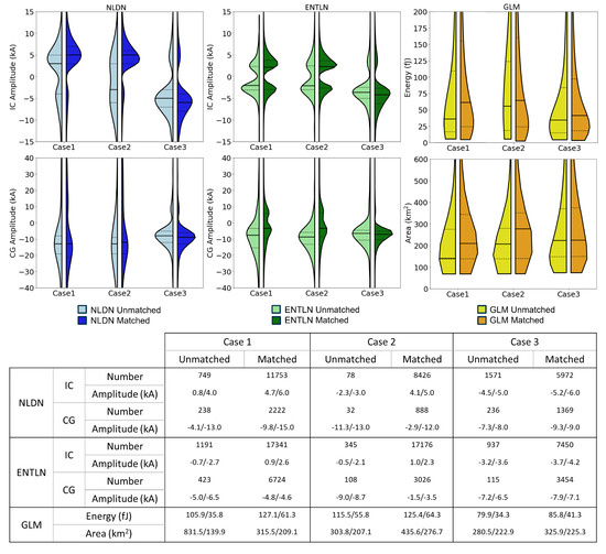 Characteristics of unmatched (left lighter colors) and matched (right darker colors) flashes to LMA for IC and CG amplitudes of ENTLN (green) and NLDN (blue); GLM (yellow) energies and footprints for Case 1, Case 2, and Case 3. Mean/median values for each network and case are shown in the table below. In violin plot, the black solid line is the median, and dotted lines are the 25th and 75th percentiles.