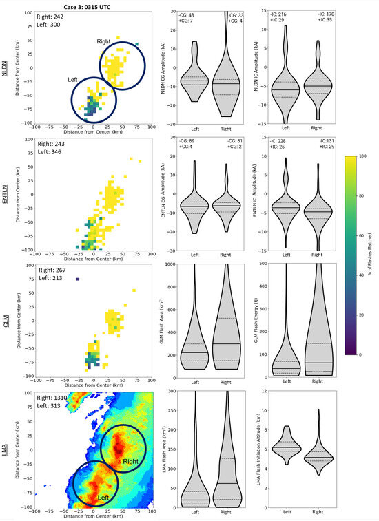 Example of a time where lightning networks differ. Time of example is 0315 UTC on 27 February 2023. Contoured percentages of flashes matched for each network (left) and violin plots (right) of flash characteristics unique to each network comparing the right and left region where matching between networks differed for each network are shown. Flash totals for each region are also displayed in the upper-left of the spatial plots.