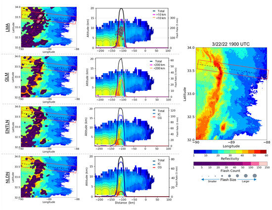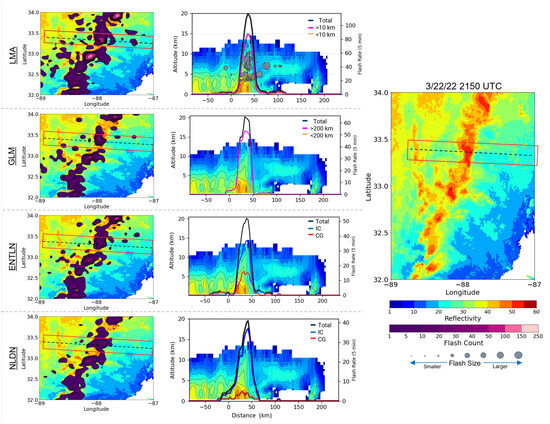 Example of a time where lightning networks differ. Time of example is 1900 UTC on 22 March 2022. Contoured flash rates for each network (left) and cross sections through the QLCS (middle) for each network are shown, as well as the overall location of the cross sections in the QLCS (right).