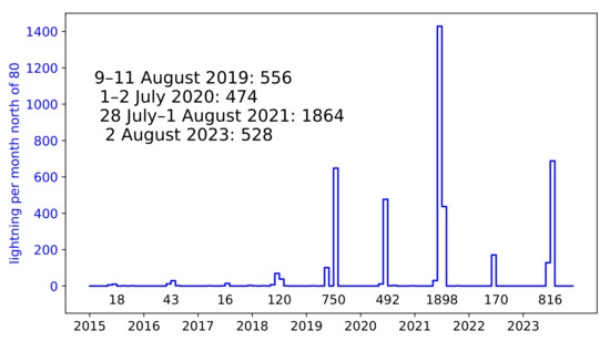 The number of lightning discharges per month during 2015–2023, north of 80° N, detected by WWLLN. These discharges were associated mainly with four significant storms.