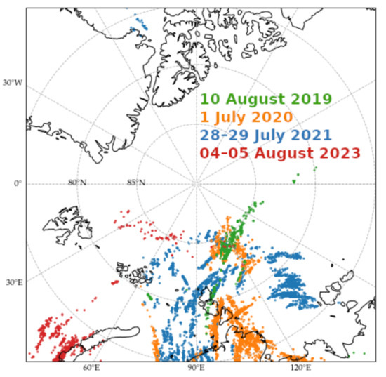 Figure 2 shows location of strikes north of 75° N during mentioned thunderstorms in 2019, 2020, 2021, and 2023.