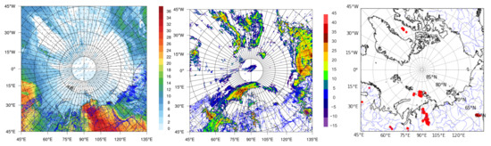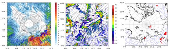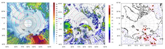 First of all, the figures reveal the local temperature maximum on the coast of the Arctic Ocean. The sea surface stays cold with temperatures lower than 10 °C. It leads to high-temperature contrast between the sea surface and the land surface. An evolution of the areas of high radar reflectivity happens as follows (see figures in Supplementary Materials). The development of the convective system starts over hot land. There is a usual storm front which we could see in middle latitudes. It is usually a mesoscale atmospheric vortex that then moves in space. In cases of abnormal thunderstorm activity around the North Pole, it moves to the upper latitudes.