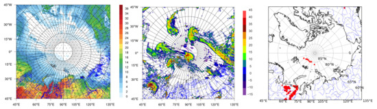 The polar lows that develop along the polar jet stream enhanced by this summer north–south temperature gradient have significant values of CAPE (not shown), producing significant precipitation, and associated lightning. In addition, the model dynamics of maximum radar reflectivity in the air column (mdBZ) show the regions of high mdBZ moving towards the North Pole during the storm’s lifetime. As the lightning location data show, the areas of lightning activity coincide with the areas with high mdBZ.