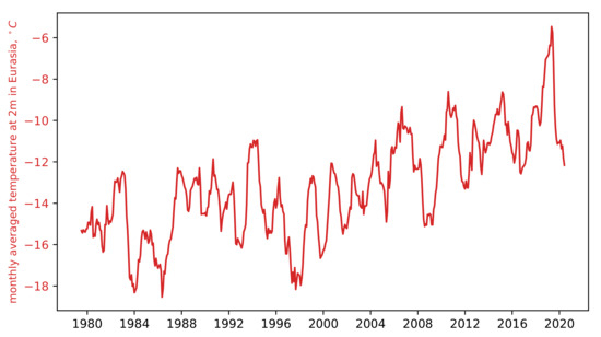 For our analysis, we take the temperature at 2 m as an indicator of climate warming. We calculated the moving average value with 12-month window to eliminate the seasonal variation in temperature.