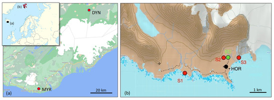 Maps of Iceland (a) and Svalbard (b) with locations of the sampling sites.