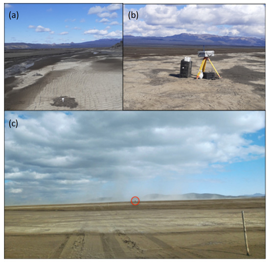 Sediment (a) and suspended dust (b,c) samplings at Dynjusandur (DYN), Iceland. The red circle marks the operator while performing personal sampling. Peak dust concentrations of 400 µg m−3 were captured by the DustTrak monitor, but the concentrations were likely significantly higher in the center of the dust storm.