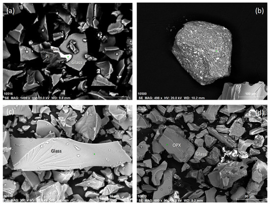 Scanning electron microscopy, secondary electron micrographs of representative phases in MYR sediment (a), MYR dust (b), DYN sediment (c), and DYN dust (d) samples. Acronyms: Pl, plagioclase; Ilm, ilmenite; mag, magnetite; CPX, clinopyroxene; OPX, orthopyroxene. MYR—Myrdahlsandur, Iceland; DYN—Dynjusandur, Iceland.