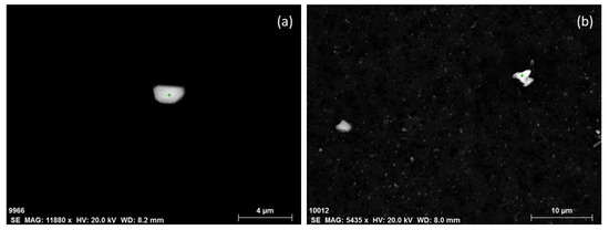 Natural particles were the main component in the aerosols from Hornsund. They showed a rich and varied composition given by silicates, sulfides, metal oxides, carbonates, phosphates, sulfates, and chlorides (Table 4). Silicates consisted of quartz, feldspars (mainly K-feldspar and albite), mica (biotite and, more rarely, muscovite/phengite), chlorite, and accessory titanite and zircon. A phase containing only Si and Al was also found, as a few dispersed grains, in samples HOR 5 and HOR 6. Rare individual crystals with shape and composition compatible with those of pyroxene were present in sample HOR 1 (see Figure 5a and Table 3b), while silicate grains with irregular shape and a composition compatible with those of volcanic glass were found in samples HOR 1 and HOR 2 (see Figure 5b and Table 3b). Grain size was fine to medium with a predominance of particles in the range 1–5 μm.
