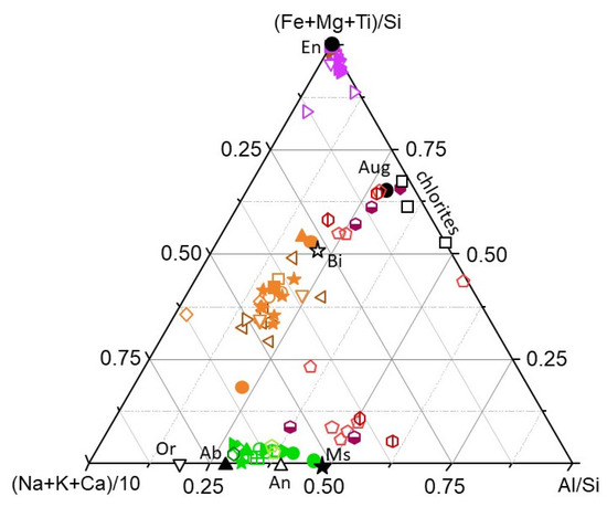 Ternary diagram of the composition of glass (orange), feldspar (green), metal oxides and silicates (violet), and the sheet silicate (mica and chlorite; red) particles in sediments (open and mid-open symbols) and dust (solid symbols) from Iceland and Hornsund (Svalbard). Symbols for samples: solid circles, M1; open circles, M1a; open squares, M1b; solid squares, M1d; solid up triangles, M2; open left triangles, D1; open right triangles, D2; open diamonds, D3; open down triangles, D5; solid right triangles, D5b; solid stars, D6; open pentagons, S1; open hexagons, S2; mid-open hexagons, S3. Acronyms: En, enstatite; Aug, augite; Bi, biotite; Or, orthoclase; Ab, albite; An, anorthite; Ms, muscovite.