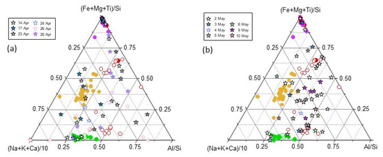 Ternary diagrams of the composition of the particles in the aerosols sampled in April (a) and May (b). The sediment and dust samples from Iceland (solid circles) and Hornsund (Svalbard; open circles) are reported for comparison. Symbols and colors are as in Figure 6, with no distinction in shape between ground sediments and resuspended dust.