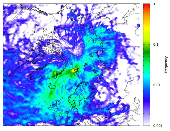 Frequency plot of the 960 backtrajectories reaching Hornsund at 500 m a.g.l. every hour from 10 April to 19 May 2019. Note the logarithmic scale to highlight areas far from the converging point.