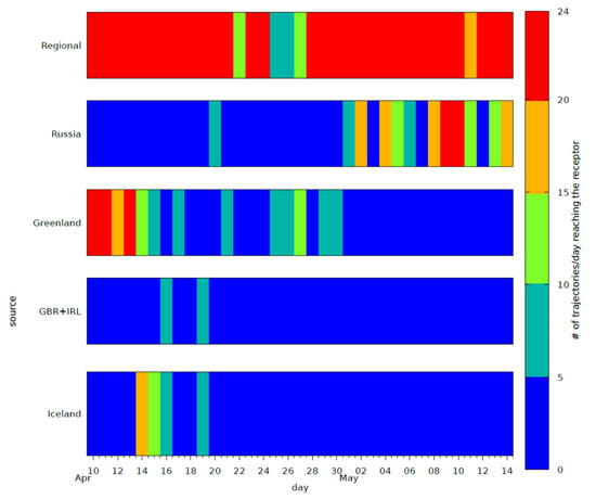 In the period under consideration, the air masses reaching Hornsund came from different geographical areas, namely, Iceland, Greenland, North Europe, and/or the British Isles and Russia. In addition to this, the area was affected by a regional circulation involving the Arctic and/or Atlantic Ocean along with Svalbard (Figure 8). The extent of the contribution of the source areas changed significantly over time (Figure 9). In fact, before 14 April, most of the contribution to the air masses came from Greenland. After that date, the circulation rotated slightly eastwards, mainly towards Iceland and the British Isles. Since 20 April, a series of incursions of air masses from Russia was registered. This situation lasted until the end of April, with the exception of a new, high-altitude, weak incursion from Iceland between 24 and 26 April. The situation changed dramatically in May when most of the atmospheric circulation reaching the receptor site was from Eurasia and the Russian Arctic.