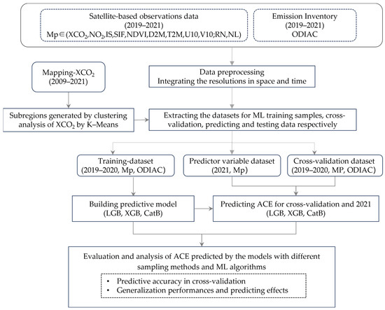 where Y is the predicted ACE, Xn is the nth predictor variable related to ACEs and the atmospheric CO2 concentration, which are the parameters obtained from the satellite-based observations, and f is the predicting model function, which is derived from machine learning, which models the relationship between Y (based on ODIAC data here) and the prediction parameters (X1, X2, X3, ……, Xn), which are XCO2, NO2, NL, IS, SIF, NDVI, D2M, T2M, U10, V10, and RN, as shown in Table 1. A flowchart of the used data and prediction approach is given in Figure 1.
