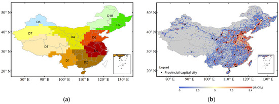 The subregions were obtained through clustering analysis of the spatiotemporal characteristics of the XCO2 data. It is known that XCO2 data derived from satellite observations demonstrate strong correlations with anthropogenic emissions [18]. We implemented the clustering analysis of the XCO2 spatiotemporal characteristics using multi-temporal XCO2 data from 2010 to 2021 using the K-Means unsupervised classification. The 10 classes (as subregions of the study area), which are shown in Figure 2a, were generated by repeatedly testing the number of classes and the maximum number of iterations to better account for the accuracy of the classification and the heterogeneity of the anthropogenic emissions among the subregions. Compared to the ODIAC data, as shown in Figure 2b, these subregions clearly demonstrate the density of human activities with anthropogenic emissions; for example, D2, D5, and D6 in Figure 2a are the most developed economic zones in China; D3 and D7 are the areas with the lowest anthropogenic emission activities.