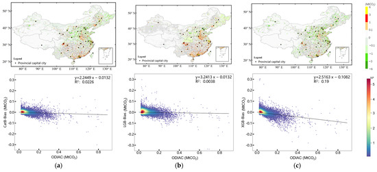 Prediction biases and scatterplots of prediction biases corresponding to ODIAC for each grid in 2021 from the three ML algorithms ((a) CatB, (b) LGB, and (c) XGB) with the SubSeg–datasets.