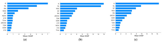 SHAP values (average impact on model magnitude) of the contributions of the prediction parameters to predictions based on the SubSeg-Sdatasets, combined with (a) CatB modeling, (b) LGB modeling, and (c) XGB modeling.