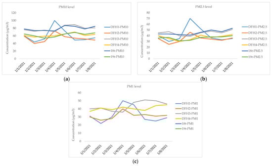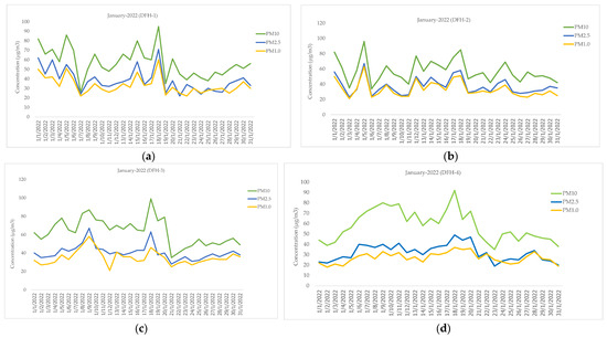 PM10, PM2.5, and PM1.0 (μg/m3) measured from LCSs during the period from 1 to 31 January 2022: (a) DFH-1, (b) DFH-2, (c) DFH-3, and (d) DFH-4.