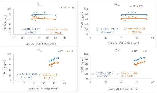 The combination of LCS enables measurement of a range of parameters such as temperature (°C), RH (%), and coarse and fine particle distributions with the Plantower Laser Dust Sensor PMS7003, as shown in Figure 2a,b. The LCS array for each monitoring site (DFH1-DFH4) was tested, and the PM concentrations were collected before starting the long-term monitoring. The particulate matter (PM) sensors were calibrated against an instrument approved by the PCD Station at Samutprakarn [3]. The LCSs for PM10, PM2.5, and PM1.0 were set up at the monitoring sites, and their results were compared with a TEOM monitor (18T, 19T). The PM concentrations from the LCSs and TEOM are shown in Figure 3. The highest mass concentration in all LCSs was PM10, followed by PM2.5 and PM1.0, respectively. Figure 3a shows that the DFH1 sensor recorded an average PM10 concentration of 60 µg/m3 and PM2.5 concentrations of 41 µg/m3 (Figure 3b), which were lower than the mass concentrations of 18T (PM10 = 79, PM2.5 = 46 µg/m3) and 19T (PM10 = 63, PM2.5 = 36 µg/m3). The LCS DFH2 had a lower average concentration than the TEOM monitor (18T, 19T). The average mass concentration of PM10 was 54 µg/m3 and for PM2.5 it was 34 µg/m3. The average mass concentration of PM10 with DFH3 was similar to 18T (79 µg/m3), but 19T showed a low concentration. The average PM2.5 mass concentrations were 45 µg/m3 (DFH3), 46 µg/m3 (18T), and 36 µg/m3 (19T). DFH4 had an average PM10 mass concentration of 62 µg/m3, followed by 36 µg/m3 for PM2.5. The measurement value of both reference devices (18T, 19T) was greater than the LCS in DFH4.