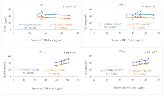 The concentration data from our LCSs (Figure 2) showed a positive correlation with the concentration data from the TEOM (Figure 4 and Figure 5). As shown in Figure 4, the PM10 of the LCSs and TEOM are correlated for each site, and the PM10 of the LCSs and TEOM scatter plots shows a good correlation for DFH3 (R2 = 0.9(18T), 0.6 (19T)), showing that the DFH3 LCS measures similarly to reference devices. The LCS DFH4 and TEOM scatter plots have a positive R2 correlation of 0.7 (18T) and 0.6 (19T). However, the data from the LCSs at the DFH1 and DFH2 sites were not correlated with that from the PCD station, likely due to the large distance between the locations of these LCSs and the PCD station. The relationship between PM2.5 from the LCSs and TEOM was also plotted. Figure 5 shows a low correlation between PM2.5 from LCSs DFH1 and DFH2 and TEOM. The above has already been explained. R2 = 0.2, 0.0 (18T), 0.2, and 0.1 (19T), respectively. However, the correlation between DFH3 and DFH4 shows that the LCS DFH3 measures similarly to reference devices (R2 = 0.7 (18T), 0.9 (19T)). Finally, the LCS DFH4 and TEOM scatter plots display positive R2 correlations of 0.44 (18T) and 0.7 (19T), respectively. DFH3 and DFH4 had a positive correlation with TEOM because they are close to the reference monitor locations. Larger distances between the LCS and TEOM may lead to larger differences in simultaneous readings. In addition to site factors, field testing may reveal distinct correlations between emission sources (residential and transportation). In terms of PMS7003 correlation with reference stations, Bulot et al. [62] found an R2 (R2 > 0.6) that is extremely close to our investigation (DFH3, DFH4). LCS testing was conducted during 1–8 December 2021. The average concentrations of PM10, PM2.5, and PM1.0 at the four monitoring sites were 53–79 μg/m3, 34–45 μg/m3, 40–51 μg/m3, respectively. The PCD station was unable to collect both particle sizes (PM10 and PM2.5) because of an instrument limitation; thus, only the daily averages of the PM10 and PM2.5 concentrations measured at DFH1 to DFH4 and PCD were compared. The average concentrations of PM10 and PM2.5 from the 18T station were 79 μg/m3 and 46 μg/m3, respectively. The 19T station gave average concentrations of PM10 and PM2.5 of 63 μg/m3 and 36 μg/m3, respectively.