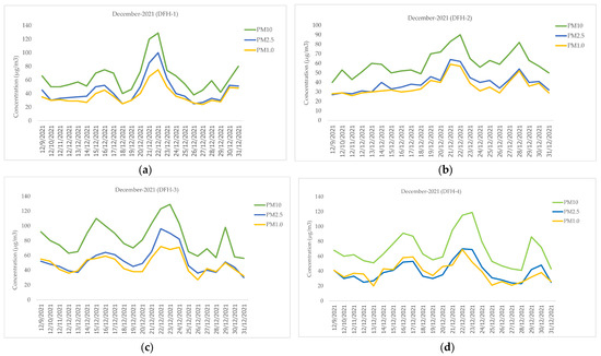 PM10, PM2.5, and PM1.0 (μg/m3) measured from LCSs during the period from 9 to 31 December 2021: (a) DFH-1, (b) DFH-2, (c) DFH-3, and (d) DFH-4.