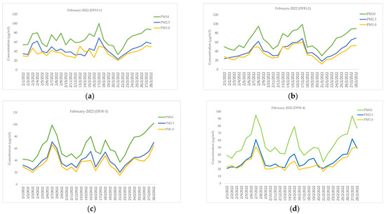 PM10, PM2.5, and PM1.0 (μg/m3) measured from LCSs during the period from 1 to 28 February 2022: (a) DFH-1, (b) DFH-2, (c) DFH-3, and (d) DFH-4.