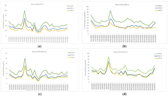PM10, PM2.5, and PM1.0 (μg/m3) measured from LCSs during the period from 1 to 31 March 2022: (a) DFH-1, (b) DFH-2, (c) DFH-3, and (d) DFH-4.