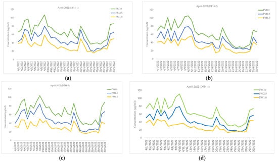 PM10, PM2.5, and PM1.0 (μg/m3) measured from LCSs during the period from 1 to 30 April 2022: (a) DFH-1, (b) DFH-2, (c) DFH-3, and (d) DFH-4.