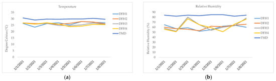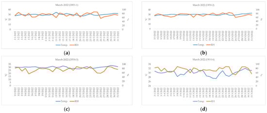Air temperature (°C) and RH (%) measured from LCSs during the period from 1 to 31 March 2022: (a) DFH-1, (b) DFH-2, (c) DFH-3, and (d) DFH-4.
