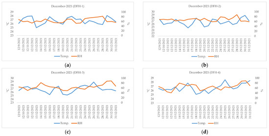 Air temperature (°C) and RH (%) measured from LCSs during the period from 9 to 31 December 2021: (a) DFH-1, (b) DFH-2, (c) DFH-3, and (d) DFH-4.