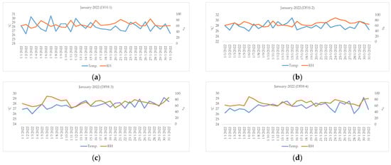 Air temperature (°C) and RH (%) measured from LCSs during the period from 1 to 31 January 2022: (a) DFH-1, (b) DFH-2, (c) DFH-3, and (d) DFH-4.