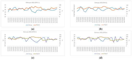 Air temperature (°C) and RH (%) measured from LCSs during the period from 1 to 28 February 2022: (a) DFH-1, (b) DFH-2, (c) DFH-3, and (d) DFH-4.