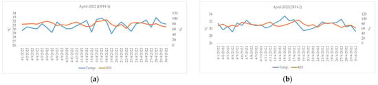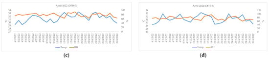 Air temperature (°C) and RH (%) measured from LCSs during the period from 1 to 30 April 2022: (a) DFH-1, (b) DFH-2, (c) DFH-3, and (d) DFH-4.