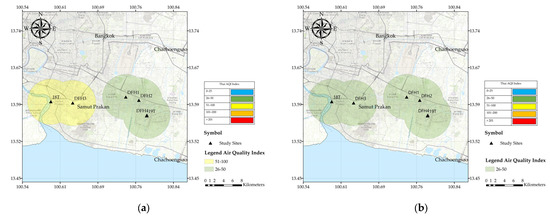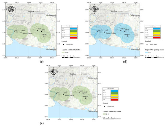The air quality index (AQI) data used to report pollution concentration in Thailand was calculated from the LCSs in all sites; their values and color code of each month are shown in Figure 17. Daily PM10 concentrations (calculated from an average over 24-h) at all LCSs were selected to calculate the AQI equation because PM10 had higher values than the other particle sizes. Based on our results, PM10 played a significant role in the AQI (Figure 17a–e). Since the PM2.5 and PM1.0 levels were lower than the PM10 level, our results could not indicate their hazard level. Different pollutants have different toxicities and health risks; consequently, the AQI is predicted from estimates of the pollutants CO, NO2, O3, SO2, PM10, and PM2.5 and is calculated from the average concentrations of the six pollutants. Notably, the fine particles are thought to have a greater influence on the human body because they can penetrate deeper into the human respiratory system. The complete data were imported to GIS and then created in map form. The PM mass concentration was higher in December to February than March–April. As a result, the PM mass concentrations for AQI were estimated using the Thailand AQI standard equation. A pattern of geographic contribution and large variation was shown for the various monitoring sites. The AQI values of Samutprakarn province were visualized via PM mapping. This research revealed that the months of December through February were yellow and green, respectively, while March and April were blue and green at our monitoring sites. The AQI values showed good to moderate results. During our study period, the results demonstrated satisfactory air quality from January to April 2022, as indicated by blue (Figure 17d) and green (Figure 17e), respectively. However, the DFH3 showed higher levels of pollutants, and the pollutants were likely from an anthropogenic contribution since this site was a residential area, as shown in Figure 17a).