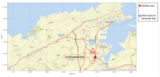 The characteristics of the study area (Bay of Santander, northern Spain) were previously reported [23,24]. Briefly, Santander is the capital and major city of the Cantabria region (about 172,000 inhabitants in 2022); although it is mainly characterized by commercial and service-based activities, the presence of some industrial sources in the southern part of the bay leads to moderate to high levels of some metals in ambient air, mainly in Maliaño, where a ferromanganese alloy plant with an annual production capacity of more than 100 kt of ferromanganese and silicomanganese is located. In a former work, the contribution of this plant to the total Mn emissions in the study area was estimated to be 91% [24]. As a typical Spanish northern coastline region, it has an Atlantic climate with mild temperatures and frequent rainfall. The prevailing wind direction in this area is SW; so, Maliaño and Santander are located downwind of the industrial source of Mn, leading to elevated airborne Mn levels [23,24,25]. Due to these high levels of Mn, this area was selected for the BIONEUROMET cross-sectional study; a detailed description of the recruitment process was previously published [30,31]. Overall, a final adult study population (n = 130) was obtained from the town of Maliaño (n = 65) and the rest of the bay (n = 65), mainly from the city of Santander, located between 5 and 10 km from this Industrial Emission Source (IES) of Mn. The location of the residence of the BIONEUROMET participants and the ferromanganese plant are found in Figure 1.