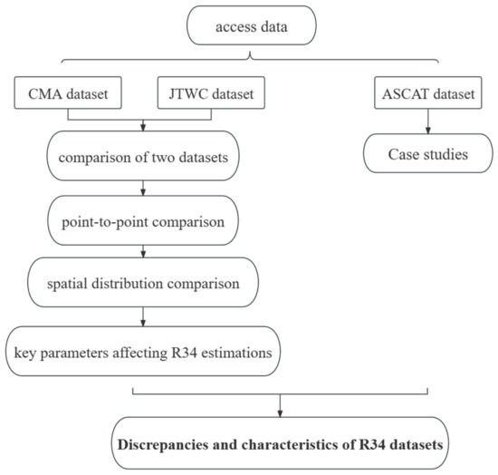 The CMA constructed an objective TC size dataset in the WNP based on the correlation between TC size and brightness temperature distribution by incorporating HURSAT data and satellite imageries from GOES, MET, GMS, MTS, and FY2 [25], and a continuous dataset from 2001 to 2016 on the WNP TC size was established. However, how the wind radius estimates of the CMA and JTWC differ and whether they have unique characteristics have yet to be evaluated. Therefore, this study aims to investigate the characteristics of R34 estimated by two agencies. The objectives include examining the correlation between the two datasets, analyzing their spatial distribution characteristics, and studying the variations in their R34 discrepancies. After conducting a systematic statistical analysis of the discrepancies between the two datasets, a case comparison study is performed using the ASCAT dataset. This additional analysis aims to reveal more detailed characteristics of the two datasets. The flow diagram of this study is shown in Figure 1. The rest of this paper is organized as follows. Section 2 describes the data and methods used. Section 3 compares R34 estimates between the two agencies. The final section summarizes the results and concludes this paper.
