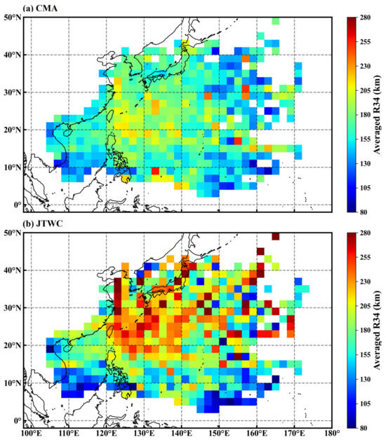 To compare the spatial distribution of the R34 estimated by two agencies, we first grouped the R34 data into 2° × 2° grids. Following the approach suggested by Kim et al. [24], we then utilized a 4° × 4° moving window to calculate the average R34 values from both agencies. The primary objective of this approach was to minimize the potential impact of spatially variable outliers on the overall analysis. The resulting spatial distributions of R34 from the CMA and JTWC datasets are depicted in Figure 3. Notably, significant differences between the two datasets can be observed in the magnitude of R34 values. The average R34 radius for the CMA is approximately 220 km, whereas the JTWC reaches up to 280 km. However, despite these differences, their spatial distribution has a notable similarity, with a spatial correlation coefficient of 0.61.