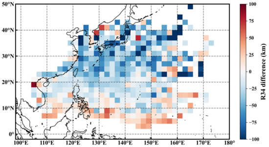 Figure 4 presents the spatial distribution of the difference in 2° × 2° R34 values between the CMA and JTWC. A noticeable characteristic is that the difference values in R34 between the two datasets tend to decrease as latitude increases. This pattern aligns with the earlier finding in Section 3.1, which indicates that the CMA tends to report larger R34 values for smaller TCs compared to the JTWC. Additionally, it corresponds to the observation that smaller TCs typically form in lower-latitude regions and move northwestward, eventually developing into larger TCs, as shown in Figure 3. Seen from Figure 4, it can be found that below approximately 15° N, the CMA generally reports larger R34 values than JWTC. However, above 25° N, the situation reverses, and the JTWC’s R34 values tend to be larger than those reported by the CMA. In the intermediate region between 15° N and 25° N, the differences in R34 values between the two datasets are relatively small.