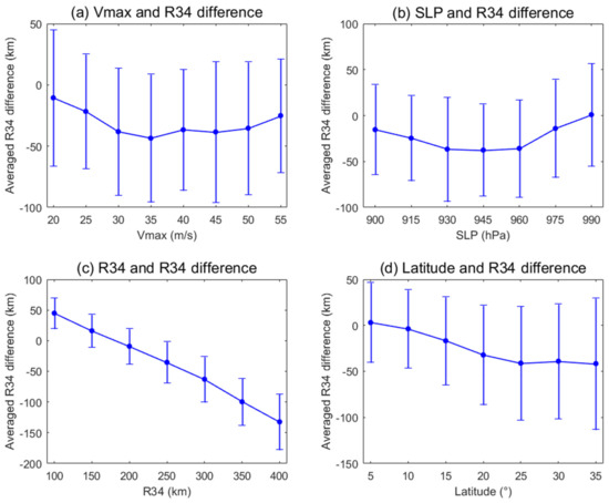The comparison of R34 difference between CMA and JTWC concerning (a) Vmax, (b) SLP, (c) R34, and (d) latitude, showing the average values (circles) and standard deviations (error bars) in each bin. Bins were defined using 5 m·s−1 intervals for Vmax, 15 hPa for SLP, 50 km for R34, and 5° for latitude.