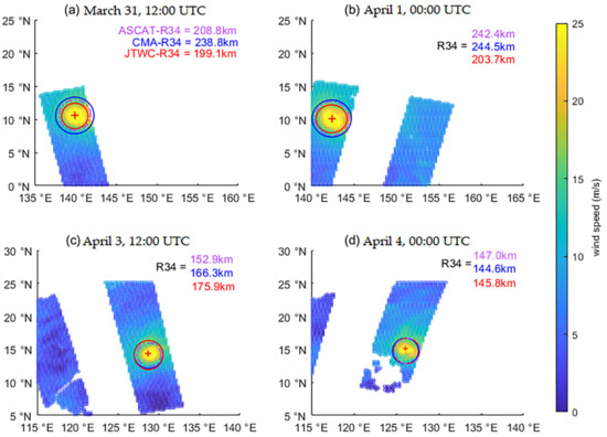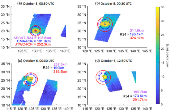 The ASCAT 10 m wind field for Typhoon ”Danasis” at four different time points, along with ASCAT R34 (purple circle), CMA R34 value (blue circle), and JTWC R34 value (red circle): (a) October 3 00:30 UTC, (b) October 5 00:30 UTC, (c) October 6 00:30 UTC, and (d) October 6 12:30 UTC. The red cross indicates the center of the TC.