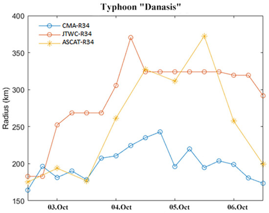 The variations in the three R34 values over time are shown in Figure 7. It can be observed that prior to 2 October, 18:00 UTC, the R34 values from the two agencies and the calculated R34 values from satellite data are similar, ranging from 150 to 200 km. Afterward, the R34 values from ASCAT and JTWC sharply increase, while the increase in the CMA’s R34 is relatively small. By 4 October, 12:00 UTC, ASCAT’s R34 and JTWC’s R34 exceed 300 km, whereas the CMA’s R34 is less than 250 km. From 5 October, 18:00 UTC to 6 October, 18:00 UTC, ASCAT’s R34 slightly increases, the JTWC’s R34 remains unchanged, and the CMA’s R34 slightly decreases. However, between 18:00 UTC on 5 October and 12:00 UTC on 6 October, all three R34 values decrease, with ASCAT’s R34 showing a more significant reduction, reaching 200 km by 12:00 UTC on 6 October, which is closer to the CMA’s R34. On average, the JTWC’s R34 aligns more closely with ASCAT’s R34, particularly capturing the rapid increase in size from 3 October to 4th. However, the JTWC’s R34 fails to capture the sharp decrease in size on 6 October. Therefore, ultimately, the CMA’s R34 is closer to ASCAT’s R34. These characteristics may be attributed to the JTWC’s use of the Dvorak method [35], which tends to capture the intensification process of typhoons during their development stages [36]. The CMA, on the other hand, did not accurately capture the rapid growth in typhoon size. As a result, there was a significant underestimation of typhoon size afterward. This observation aligns with the findings discussed in Section 3.1, where it was indicated that the CMA dataset typically underestimates larger typhoon sizes.