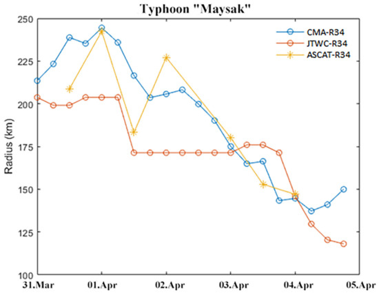 In the case study of Typhoon “Danas”, only the intensifying period is considered due to the availability of satellite data. To investigate how the R34 values estimated by the two agencies behave during the decaying stage of TCs, the second case study focuses on Typhoon “Maysak” in 2015. In this case, satellite data cover almost the entire decaying period of the typhoon, from 31 March at 00:00 UTC to 4 April at 18:00 UTC. Typhoon “Maysak” formed on 28 March UTC 03:00, 2015. It continued to intensify and reached super typhoon status on 31 March UTC 20:00. Subsequently, it gradually weakened and made landfall in the Philippines on 5 April UTC 11:00, downgrading to a tropical depression. Figure 8 illustrates the distribution of 10 m wind fields from ASCAT at four different time points during this period. The extensive coverage of satellite data ensures the reliability of the R34 values calculated from ASCAT. Furthermore, Figure 8 indicates that the three types of R34 data are consistent with each other, exhibiting only minor differences.