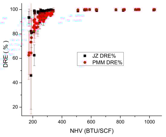 The DRE discrepancy between JZ and PMM measurement becomes larger as NHV decreases. The measurement discrepancy is correlated with the uncertainties for both JZ measurement and PMM measurement as shown in Figure 7. The average uncertainty (2σ) for JZ empirical measurement is ±0.40% for regions of NHV > 300 BTU/SCF, which is comparable to the ±0.37% uncertainty calculated from MCM analysis for the PMM method. For regions of 250 < NHV < 300 BTU/SCF, the average uncertainty (2σ) of DRE% measurement is ±2.72%. For regions of 170 < NHV < 250 BTU/SCF, the average DRE% uncertainty (2σ) is ±10.88%. These measurement uncertainties are comparable to the DRE discrepancy between JZ test and PMM measurement in the regions, with the values of 3.63% and 10.59% for regions of 250 < NHV < 300 BTU/SCF and 170 < NHV < 250 BTU/SCF, respectively. The fact that the DRE discrepancy and measurement uncertainties for both methods are comparable shows that this PMM is a reliable method for CE/DRE measurement.