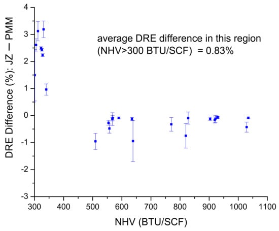 DRE difference between JZ measured value and PMM value for NHV > 300 BTU/SCF with associated uncertainty error bar for JZ test.