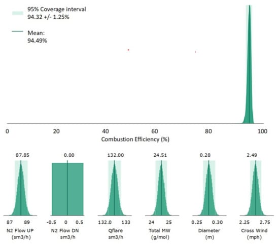 The JZ CE/DRE measurement uncertainties were mainly introduced by instrument errors and testing variabilities, such as sample extraction variation. Specifically, based on measurement uncertainties of all the inputs, such as CO2, CO, flare gas composition measurement, and so on, and their sensitivity coefficients, the CE/DRE error caused by instruments can be derived. The uncertainty caused by gas sampling can be estimated from the repeatability of CE/DRE measurement. The overall system level of CE/DRE uncertainty can be derived as the root sum square of the instrument error and sample extraction error. The detailed CE/DRE uncertainty calculation for the JZ measurement can be found in the accompanying paper [16]. The uncertainty of the PMM method has been assessed using two independent methodologies that conform to the GUM. In the first method, the error was propagated in the same way as that used by the JZ tests. In the second method, to provide a semi-independent assessment of the uncertainty, the data were analyzed using Monte Carlo method (ISO/IEC GUIDE 98-3/Suppl.1, 2008) [20], in which each input is assigned a probability density function (PDF) and then randomly tested over 1 million trials to derive a coverage probability of 95%. The mean value within the coverage was selected as the expected value. The distance between the mean value and the coverage range was deemed to be the corresponding uncertainty. The Python platform was employed to implement the PMM calculation and MCM analysis. Figure 5 highlights the corresponding information of the MCM analysis for test point 7, including the distribution of the inputs and outputs.
