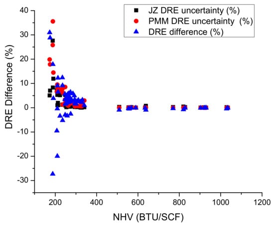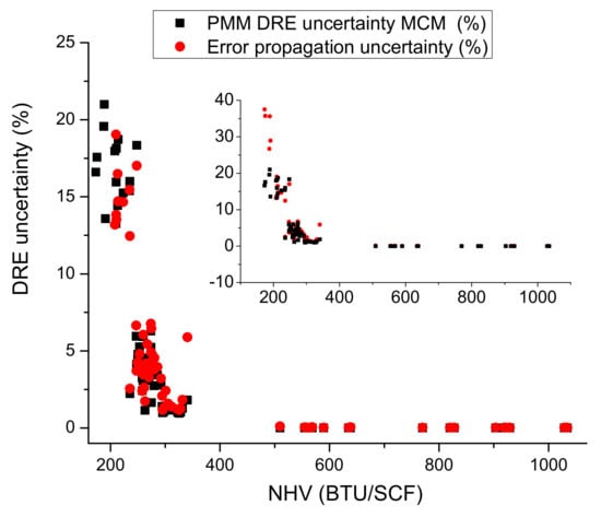 Figure 6 shows the uncertainties of DRE for PMM measurement with two standard deviations (2σ), or 95% confidence level from both direct error propagation and MCM methods. Note that the uncertainties are plotted in positive values for clear comparison, instead of +/− range. The uncertainties from both methods are consistent with each other (shown in the main plot), except for five extreme cases where the direct error propagation method did not have any limit for the DRE calculation (shown in the insert), as it should be capped to a value of 0–100%. The average uncertainty from the MCM method for the NHV > 300 BTU/SCF region, where DRE is at >98%, is ±0.37% (2σ). For regions below 300 BTU/SCF, the PMM uncertainties calculated from the MCM method increase with the values of ±3.50% and ±14.67% for regions of 250 < NHV < 300 BTU/SCF and 170 < NHV < 250 BTU/SCF, respectively.
