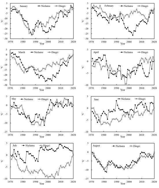 Table 1 shows that the monthly occurrences of and were in July and January at Nielamu, while occurring in July and December at Dingri. Notably, the range (the difference between and ) of Dingri was greater than that of Nielamu every month. The biggest or smallest range was 38.2 °C or 18.5 °C in January or July at Nielamu, which was 46.0 °C or 24.0 °C in December or August at Dingri. This indicates that the monthly temperature fluctuations in Dingri were more prominent than those in Nielamu.