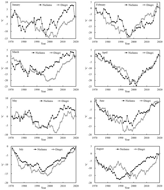 The maximum was 25.8 °C and the minimum was −31.4 °C in MQ, which all occurred in Dingri. The maximum appeared in summer, and the minimum appeared in winter. The maximum or minimum occurred in August or January at Nielamu, while occurring in July or December at Dingri. The decadal variations for and had upward trend on the whole, but the winter minimum occurred during 2011–2020 at both Nielamu and Dingri.